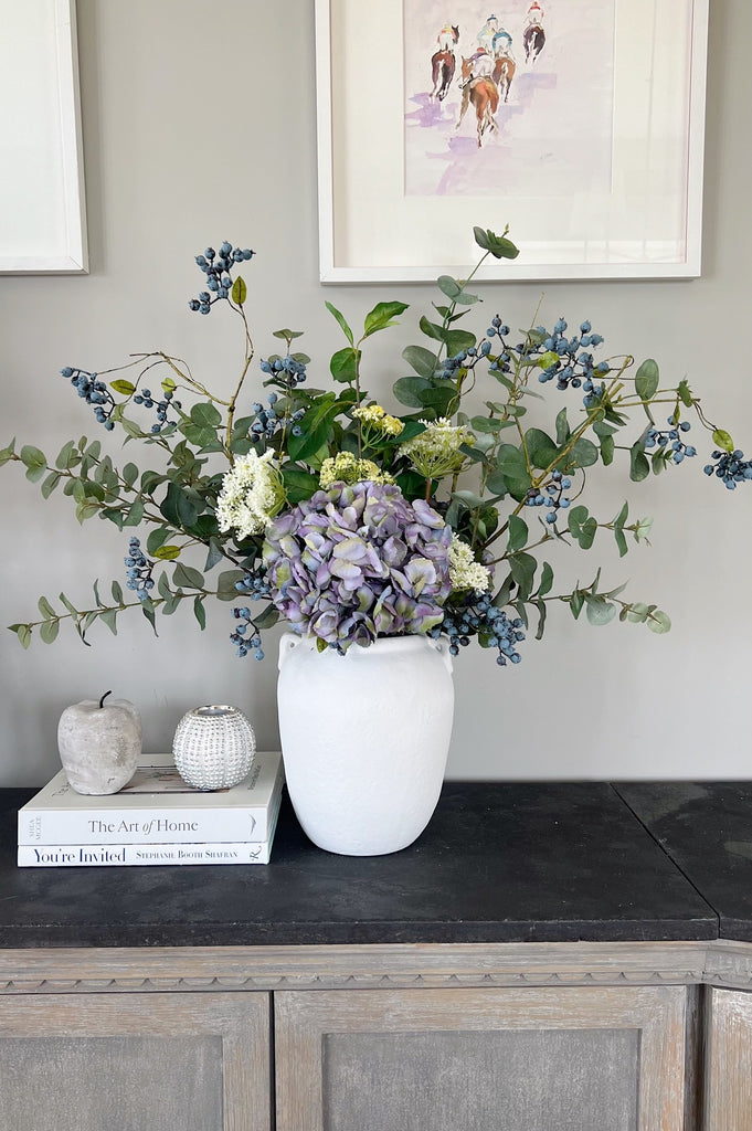 “The most amazing faux flowers, stems and vases. I have bought numerous products from Laura. Her attention to detail and the effort she goes to is out of this world. Beautiful Adonis vase with white mop head hydrangeas and eucalyptus spray…everybody compliments them when they see them. A beautiful centrepiece for my kitchen island.