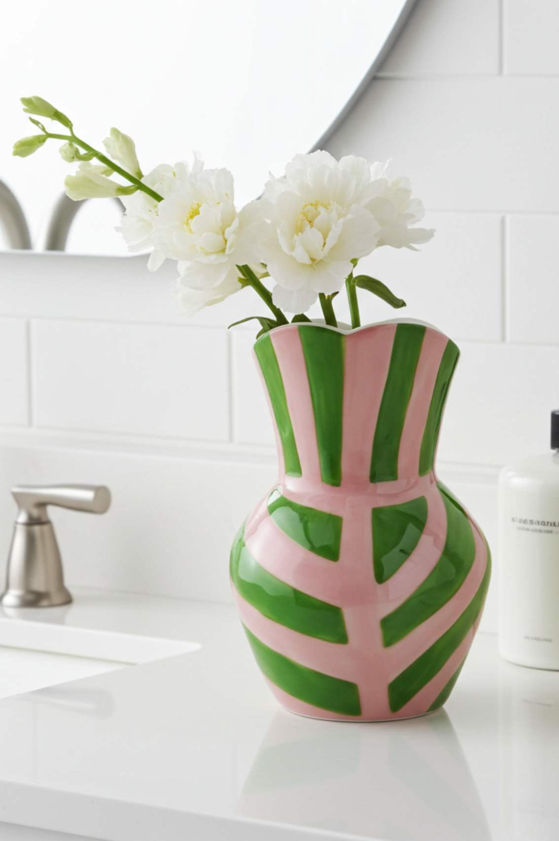 Add a pop of playful charm to your space with this ceramic green and pink striped vase. Featuring a bold, modern design with a glossy finish, it’s perfect for displaying fresh or faux blooms—or making a statement all on its own. A cheerful piece that brings colour and personality to any shelf, table, or mantel.