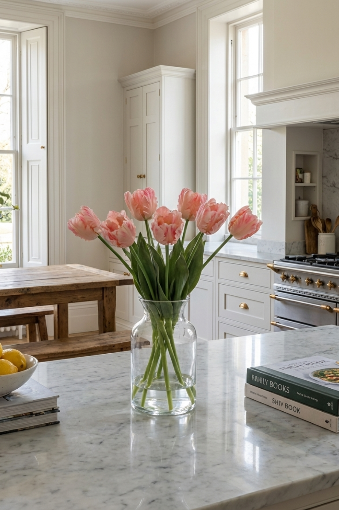 They look beautiful styled simply in a vase on their own, especially if you like that relaxed, just-gathered look. I also love mixing them with a bit of soft greenery or keeping them slightly loose and imperfect — tulips always look best that way. Perfect for adding a bit of depth to a table, console or shelf.