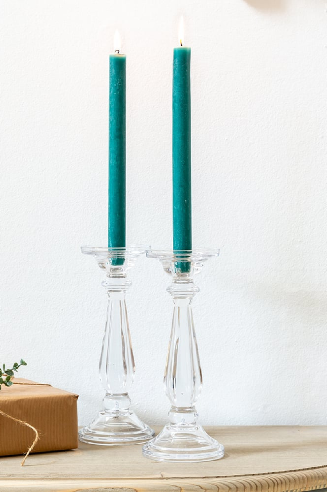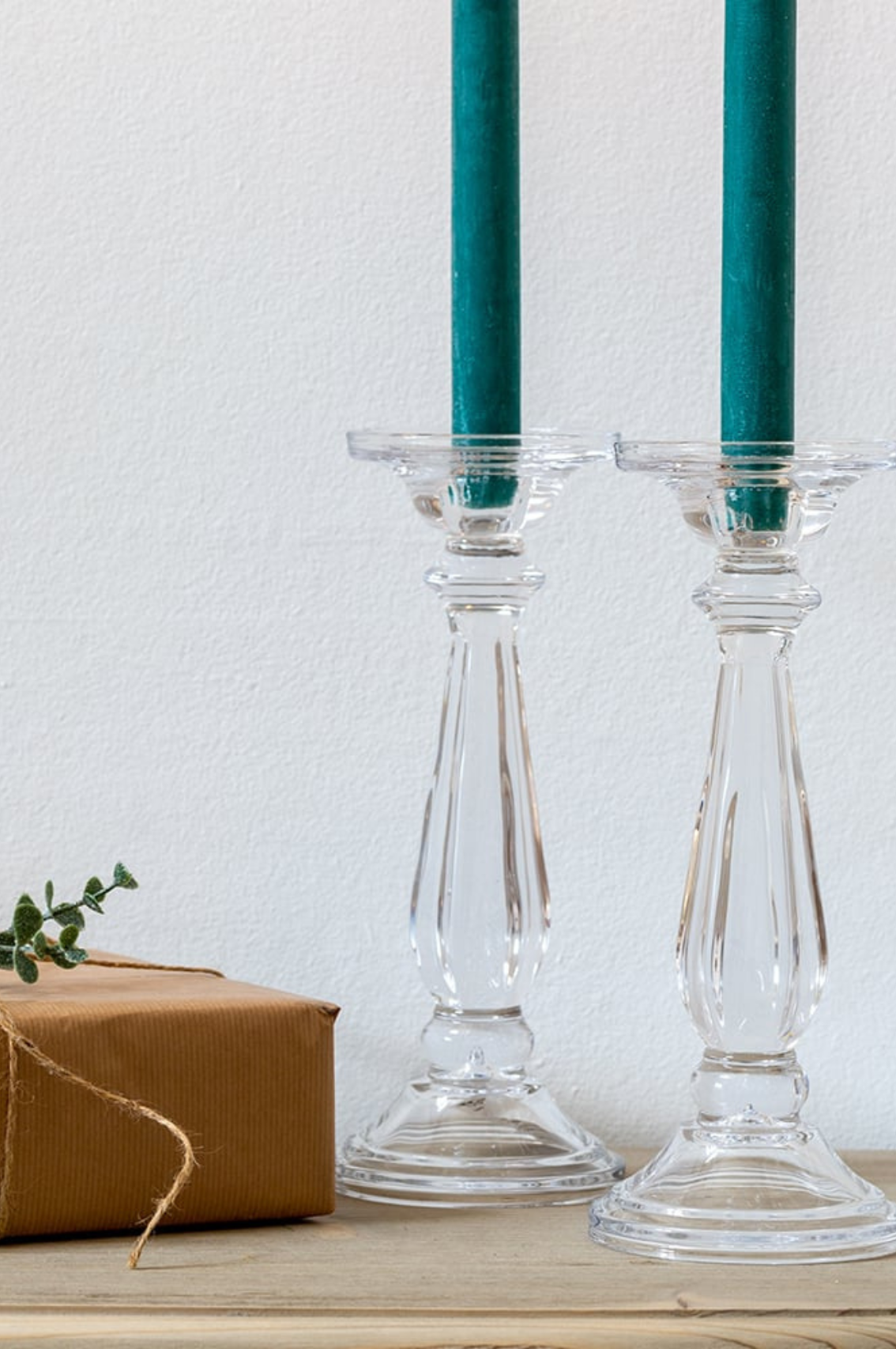 These pretty glass candlesticks are sophisticated and subtle. They make a pretty addition to your home when teamed with dinner candles. Adorn a mantle piece or use to embellish a dinner party table setting, wherever you choose to place them, we can assure they will compliment any interior.