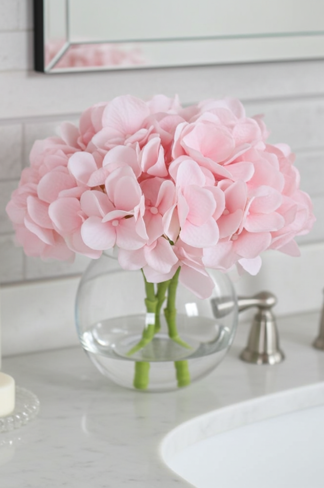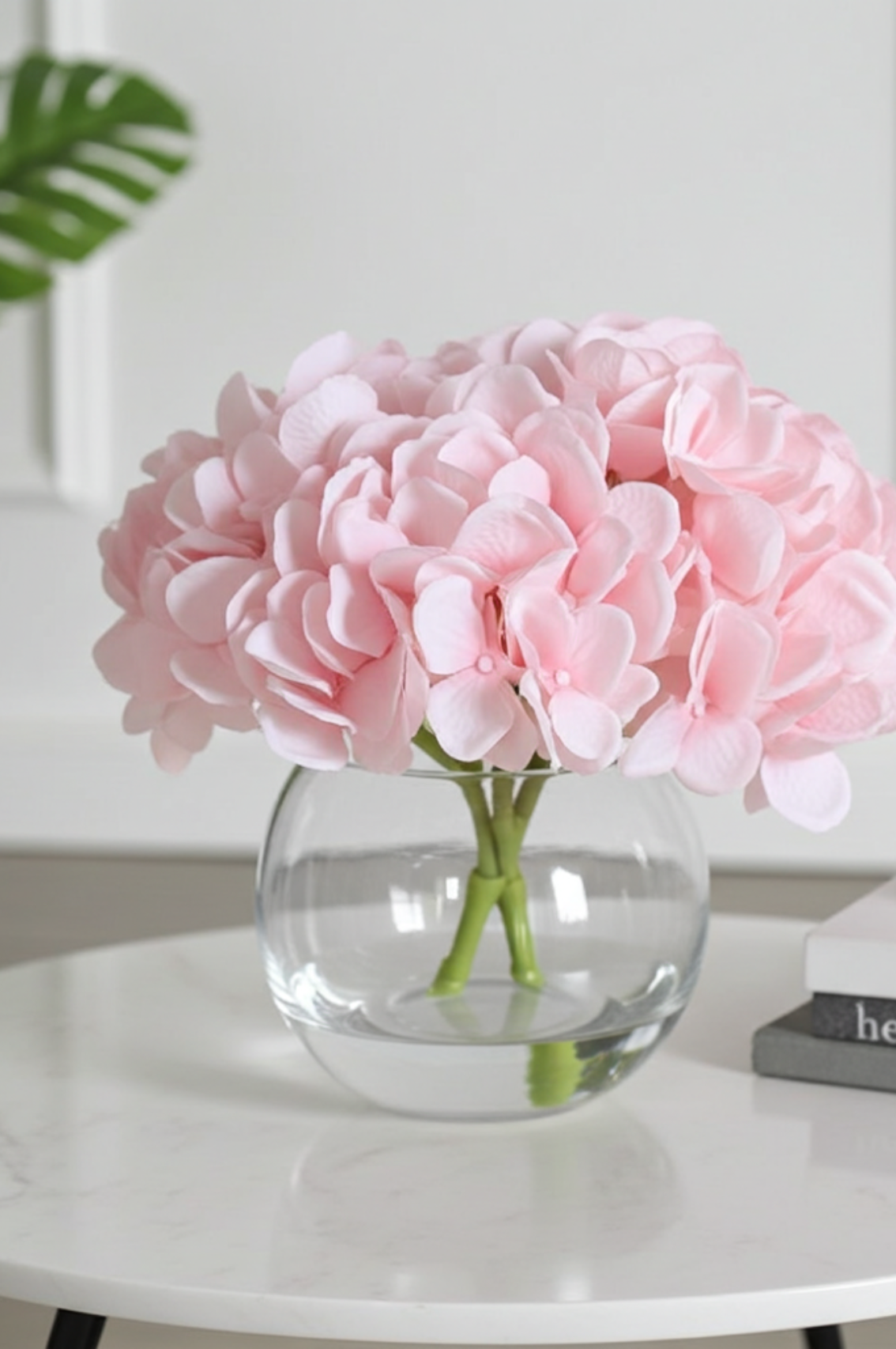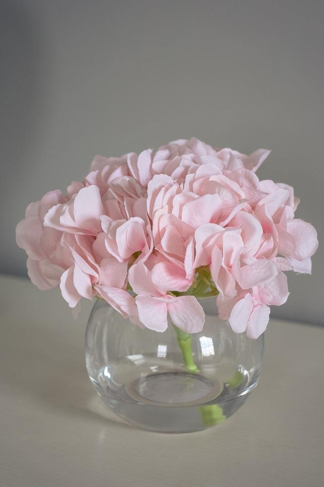 The prettiest mini arrangement featuring a soft pink Hydrangea in a little globe vase. This would be the perfect bedside accessory. A gorgeous gift for you or a loved one!
