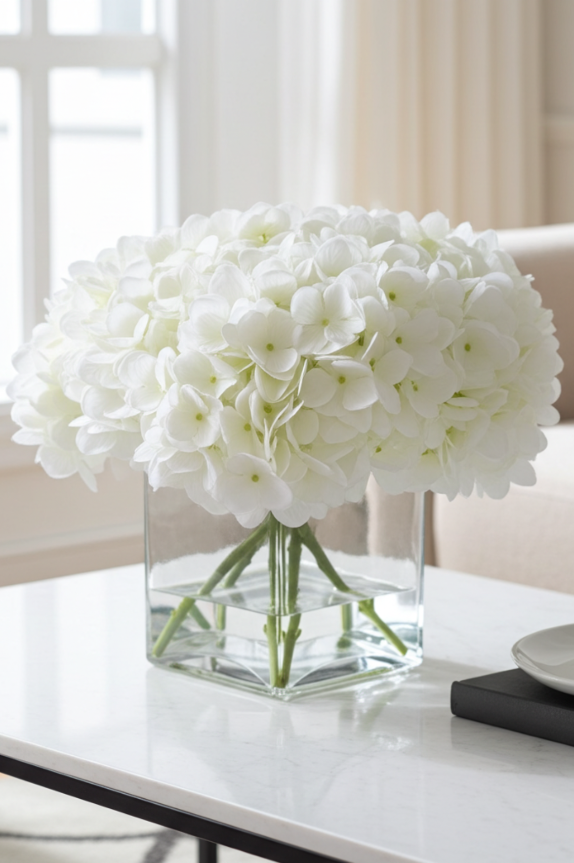 Our faux water Annabelle arrangement is all about that clean, classic look—with realistic stems set in faux water for that fresh-from-the-florist feel. It’s elegant without being too formal and works beautifully in just about any room.
