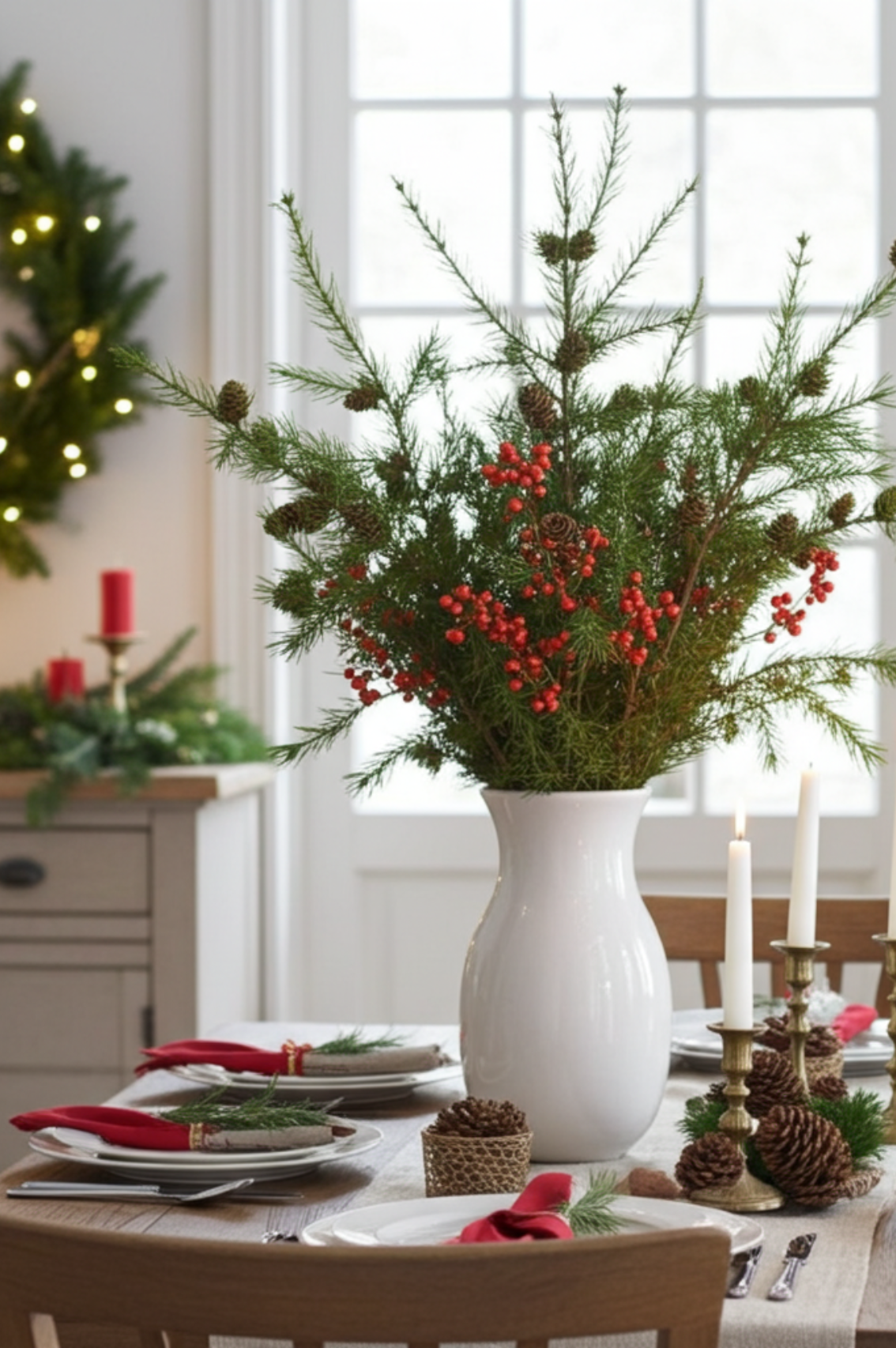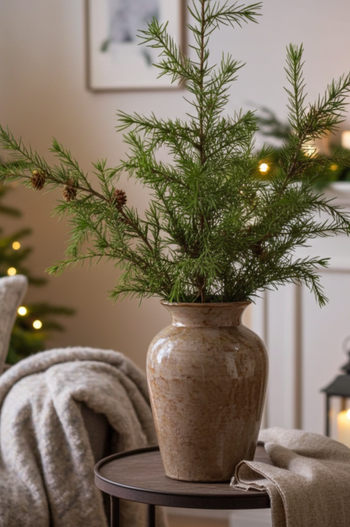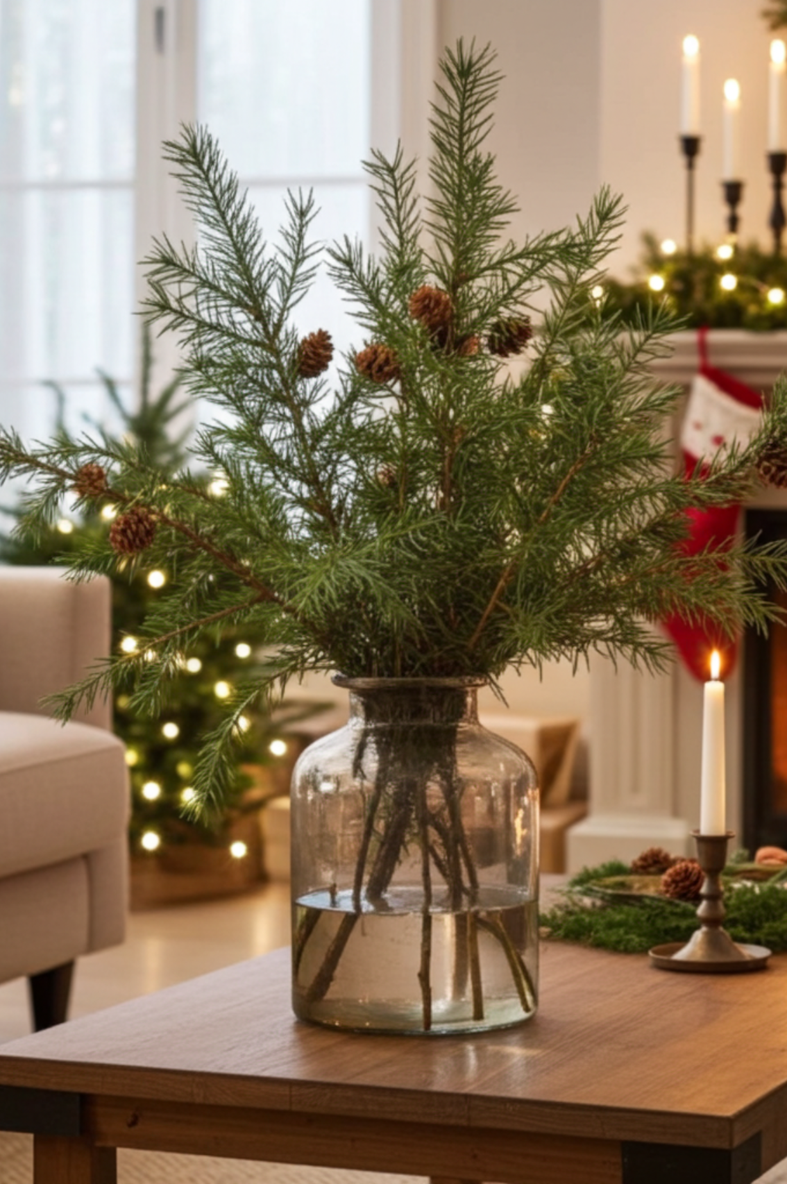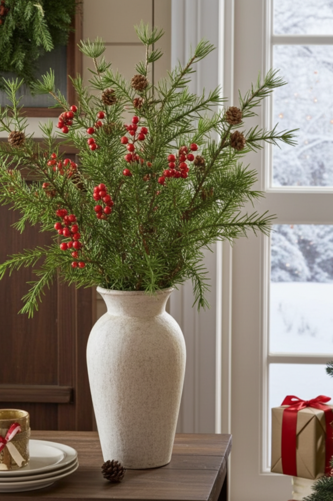 Place a few in a tall vase to create a simple, sculptural display, or mixing them with berries, eucalyptus or pine for a fuller, more layered look. It’s perfect for hallways, living spaces or a festive mantel — bringing that cosy, wintry feel without being over the top.