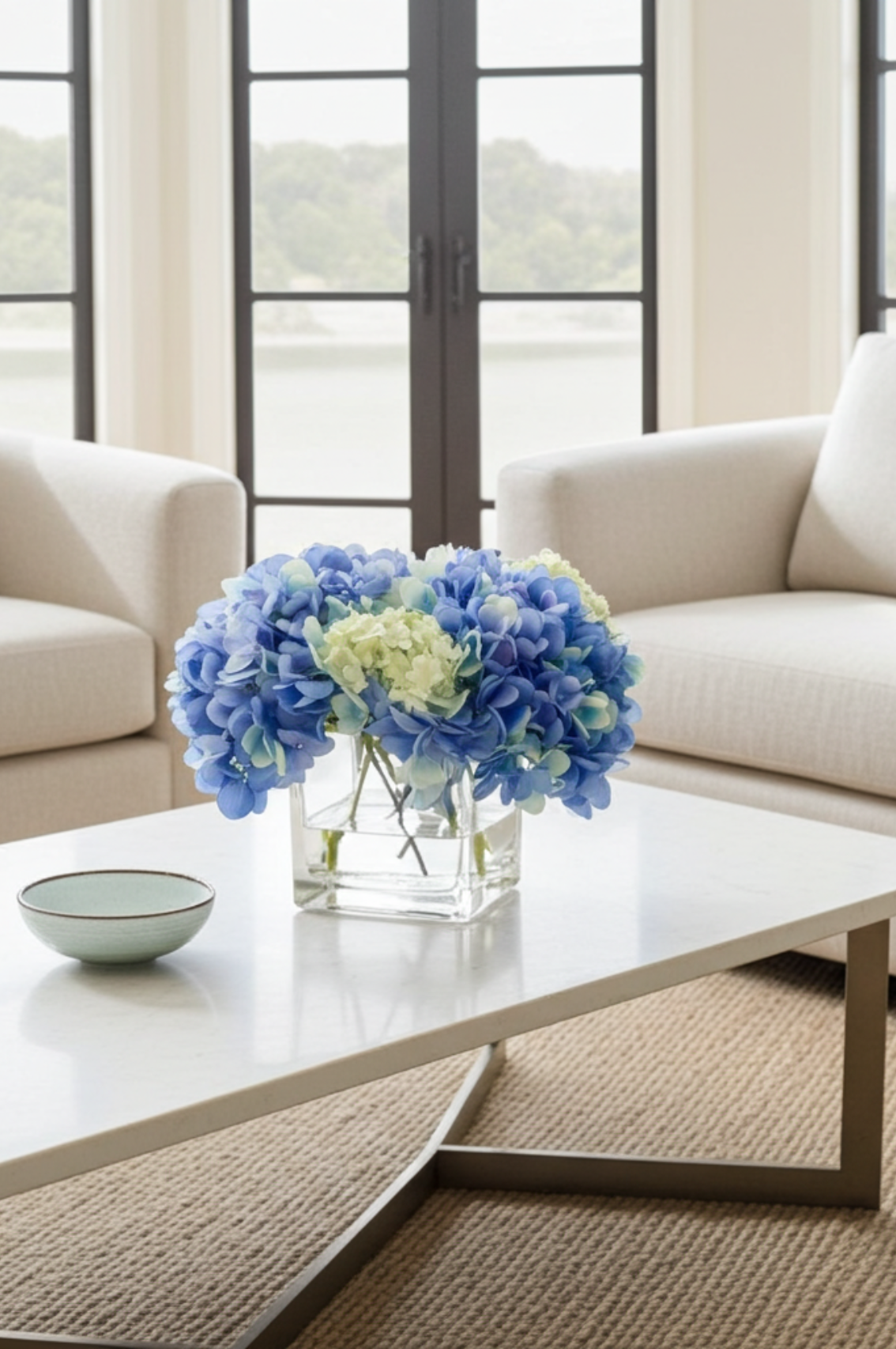 Our Faux Water Sea Breeze Arrangement is fresh, light, and full of soft blues and greens that feel like a little breath of coastal air. Set in faux water for that realistic, just-arranged look, it’s a lovely way to bring a calm, relaxed feel to your space.