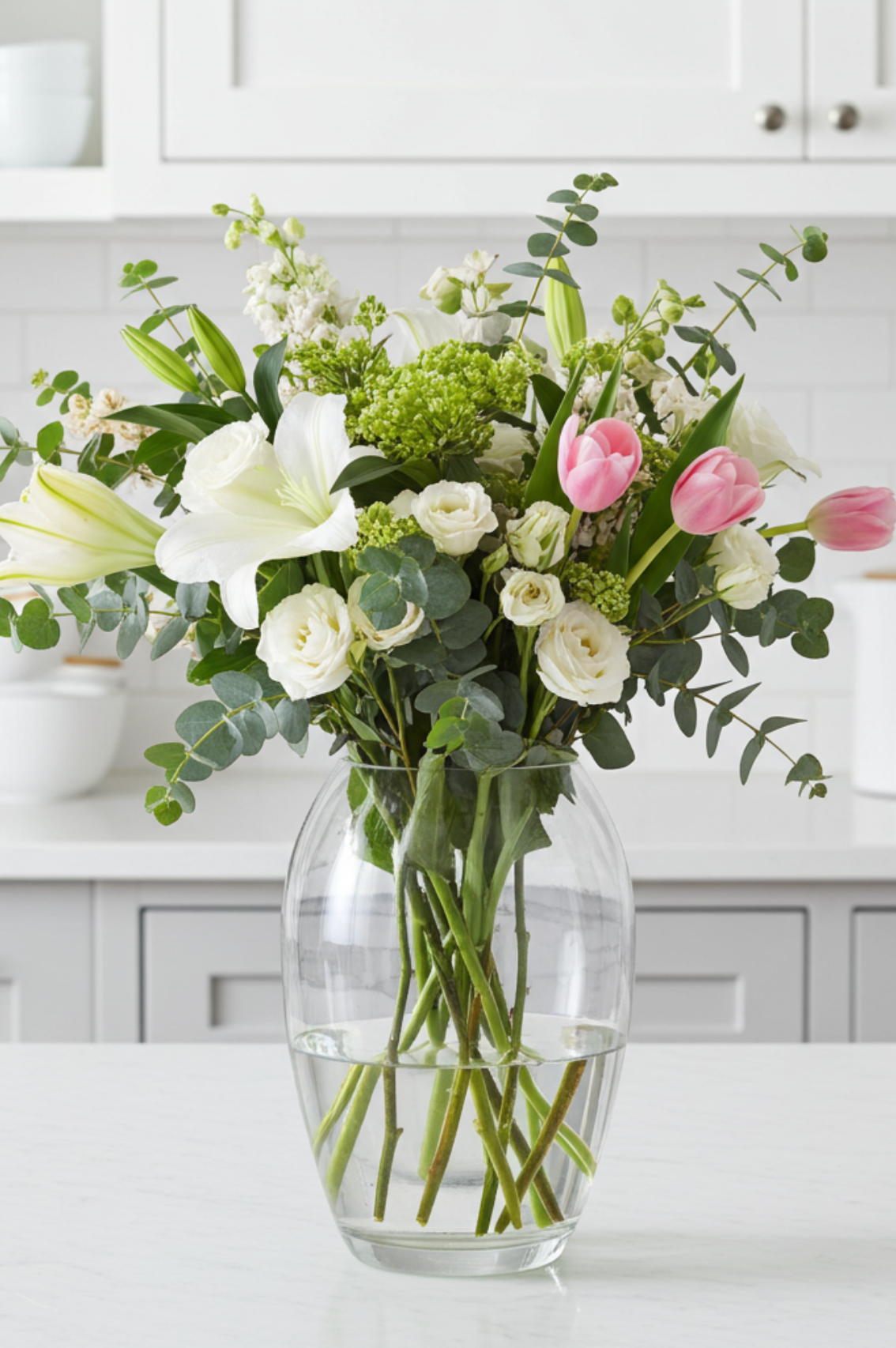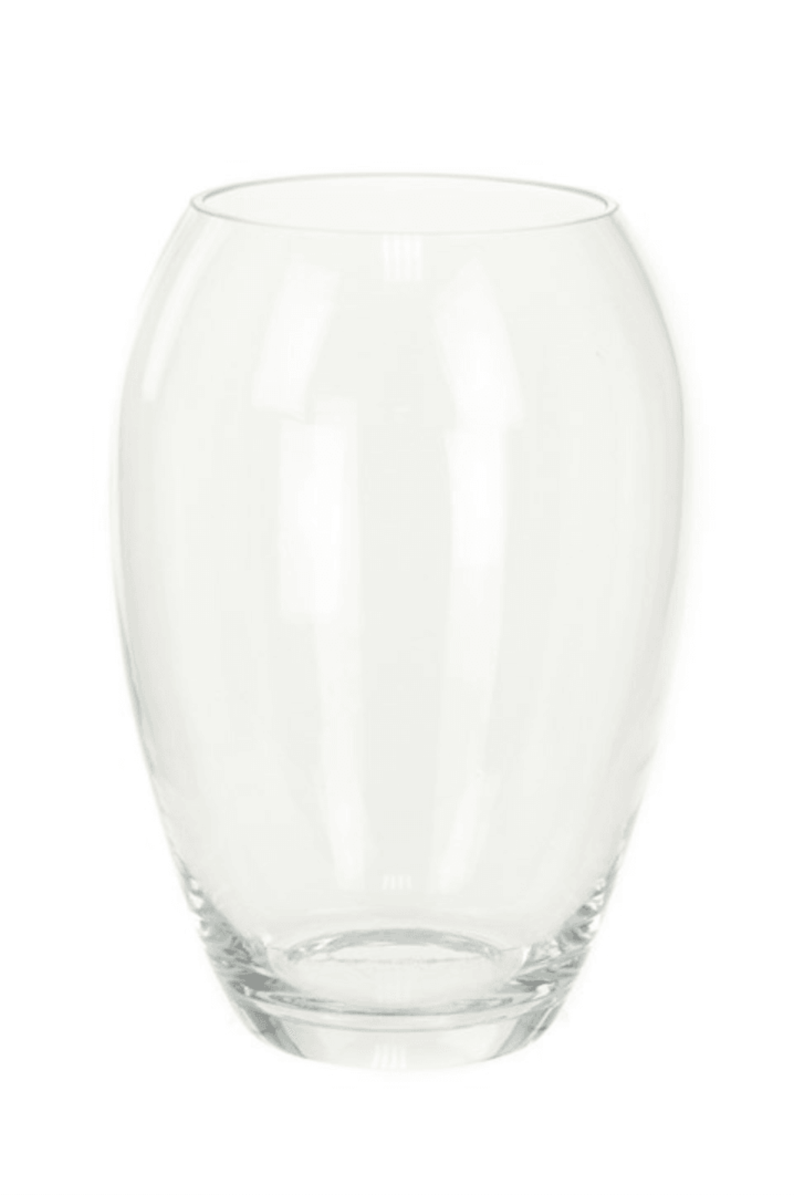 A barrel-shaped glass vase with thick, curved walls. Designed for mixed bouquets or a few large flower heads.