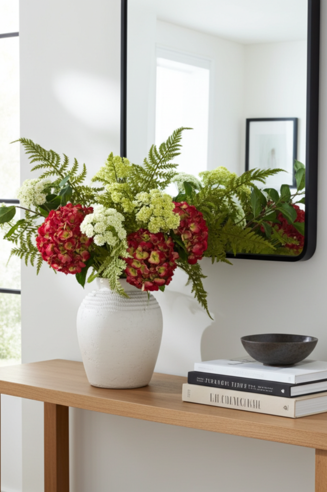 Our Faux Crimson Kisses arrangements is one of those pieces that instantly draws the eye. With its deep crimson dried-look hydrangeas, delicate Queen Anne’s lace and soft, leafy asparagus fern, it has that rich, romantic feel that’s perfect for the season. The mix of bold colour and airy greenery gives it a lovely balance — striking but still beautifully soft.