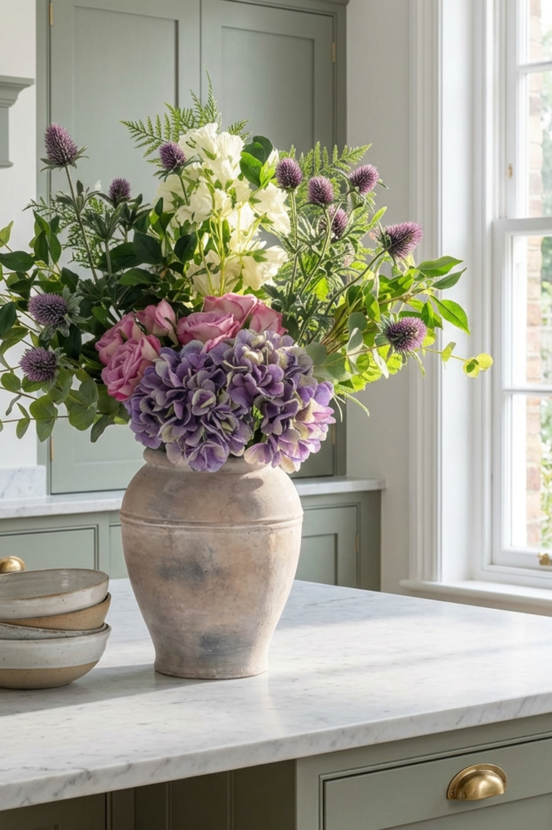 “The most amazing faux flowers, stems and vases. I have bought numerous products from Laura. Her attention to detail and the effort she goes to is out of this world. Beautiful Adonis vase with white mop head hydrangeas and eucalyptus spray…everybody compliments them when they see them. A beautiful centrepiece for my kitchen island.
