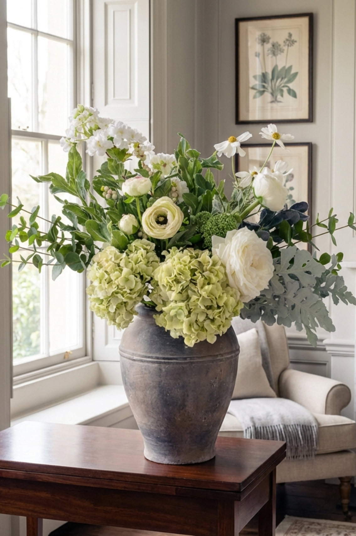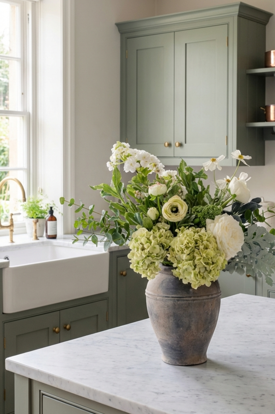 “The most amazing faux flowers, stems and vases. I have bought numerous products from Laura. Her attention to detail and the effort she goes to is out of this world. Beautiful Adonis vase with white mop head hydrangeas and eucalyptus spray…everybody compliments them when they see them. A beautiful centrepiece for my kitchen island.