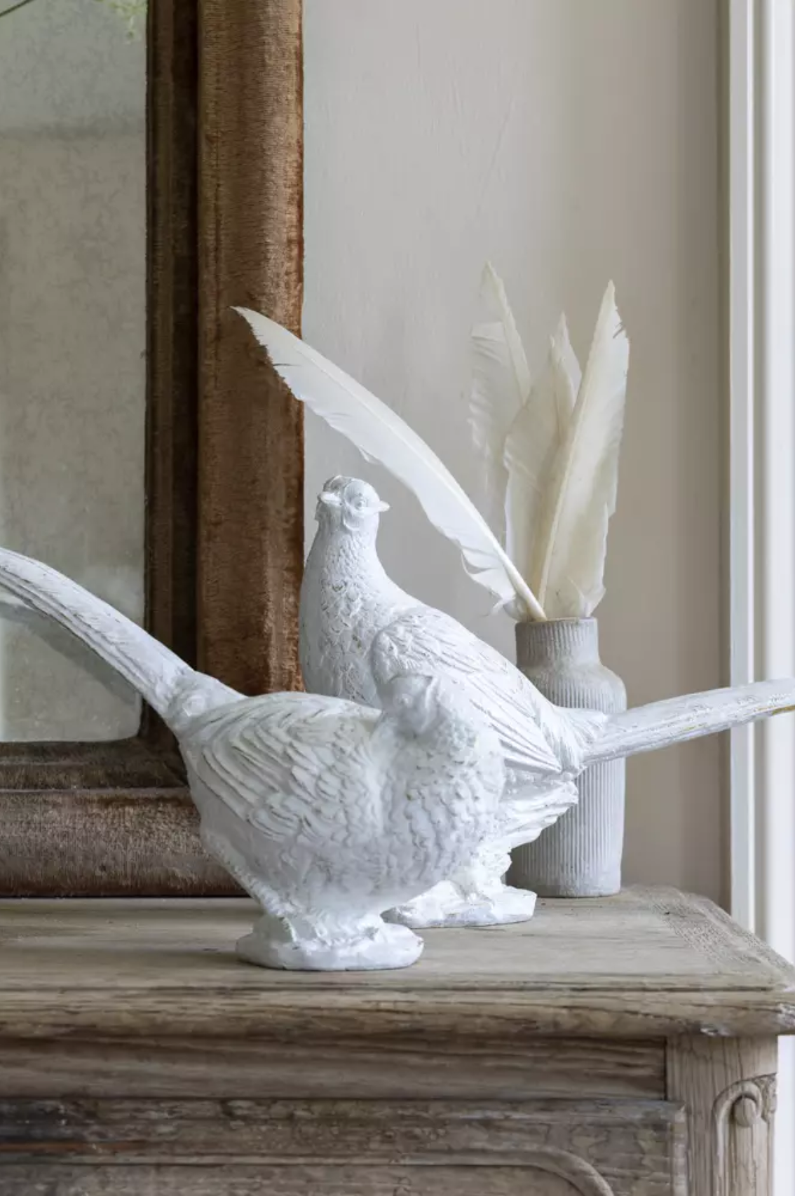 White Rupert Pheasant sculpture brings a bit wildlife elegance to your home décor. Made with durable polyresin, and measuring approximately 35cm in length, 10.5cm in width, and 20cm in height, this beautifully crafted piece features a detailed design with a sleek white finish that highlights the intricate features of the pheasant. Perfect as a decorative accent for shelves, mantels, or focal points in living spaces.